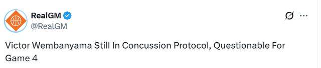 这位年度最佳防守球员,在G2第二节比赛中头部撞击地面后,便一直缺阵至今。马刺主帅米奇-约翰逊今日确认,球队两届全明星球星文班亚马仍在执行NBA脑震荡保护协议,因此马刺对阵开拓者首轮G4的出战状态暂未确定。