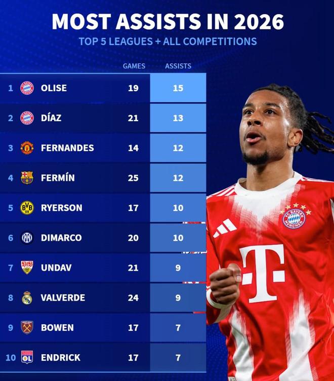 2026年五大联赛+所有赛事助攻榜:奥利塞、迪亚斯、B费前3
